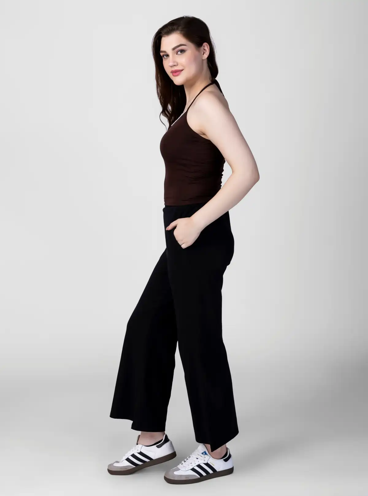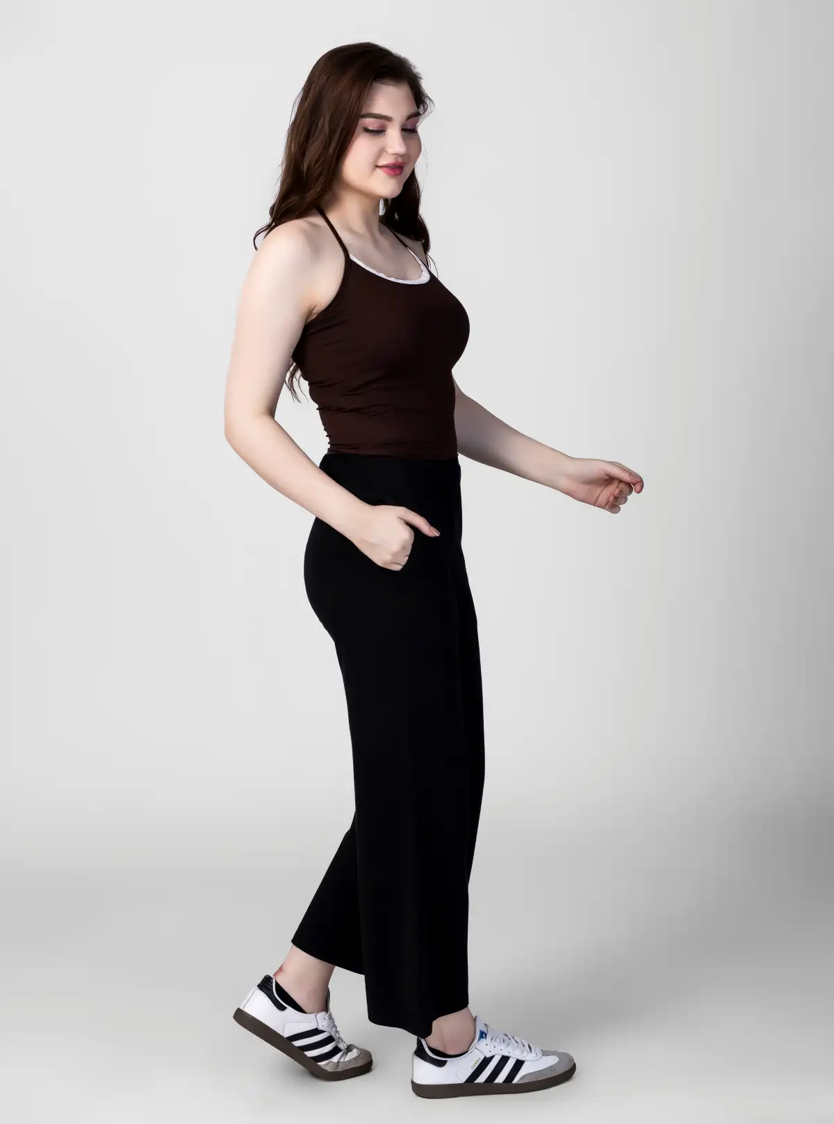 Make a statement with this backless cami crop top in rich brown, designed for maximum comfort and style. Crafted from 97% cotton and 3% lycra, its 180 GSM fabric ensures a lightweight feel with just the right stretch for a flawless fit.