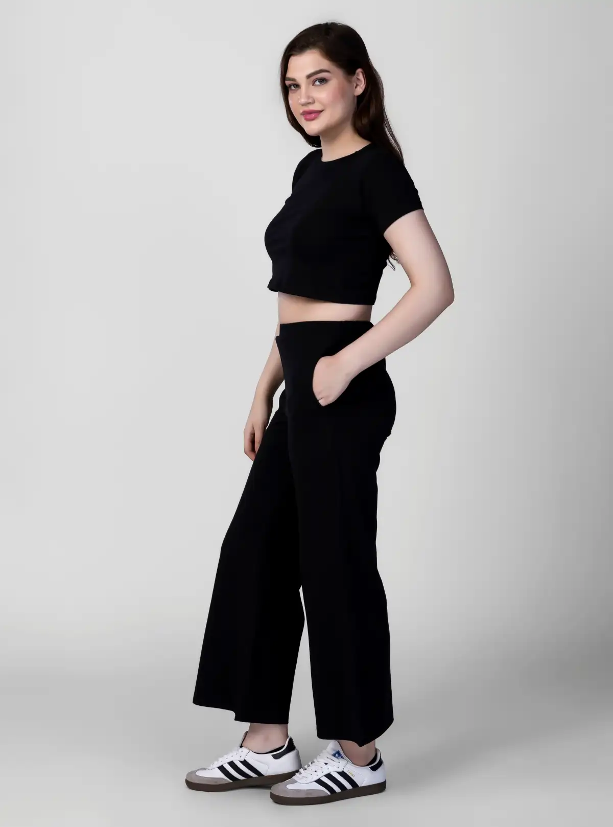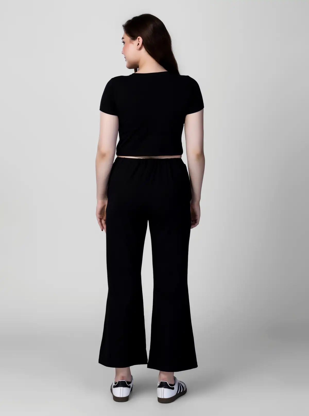 Own the casual-cool look with this all-black crop top cord set, crafted in a soft, stretch-blend of 97% cotton and 3% spandex. Designed for ultimate comfort and effortless movement, it’s lightweight (180 GSM) and perfect for lounging, outings, or travel.