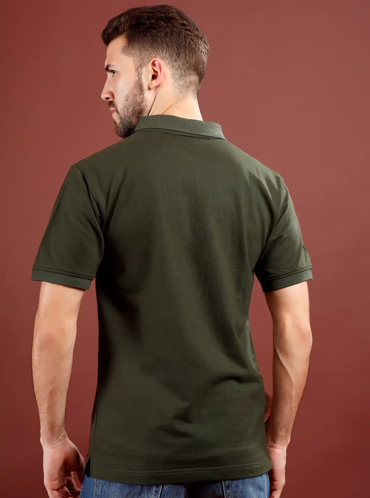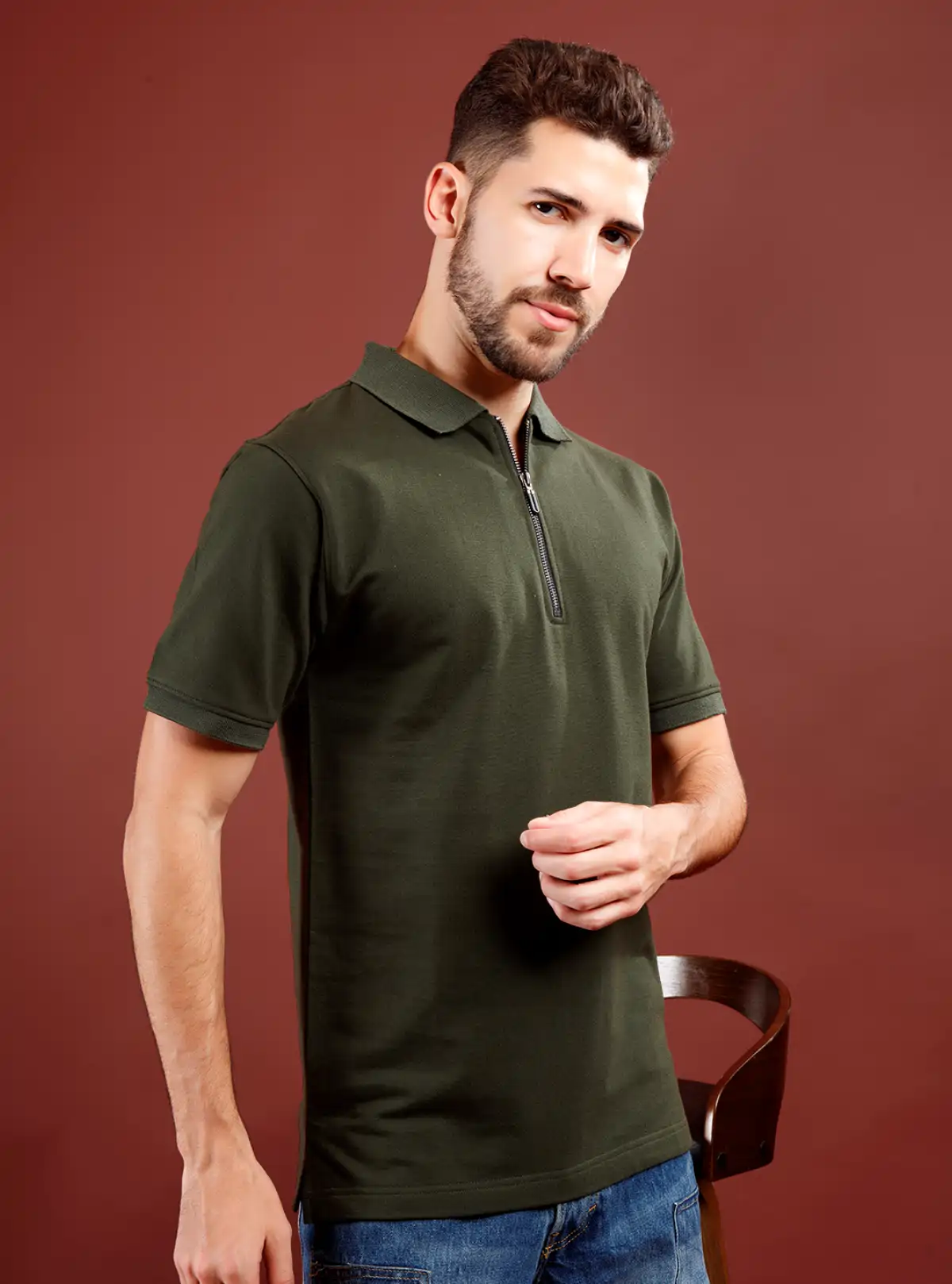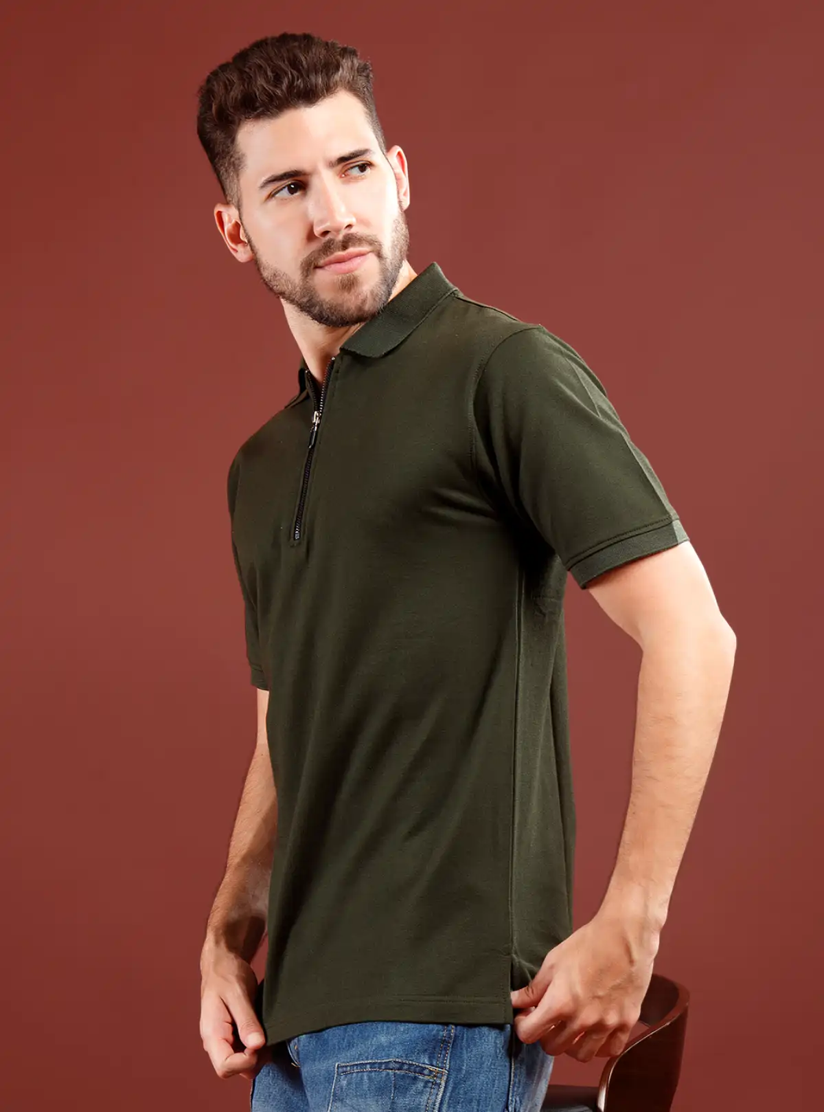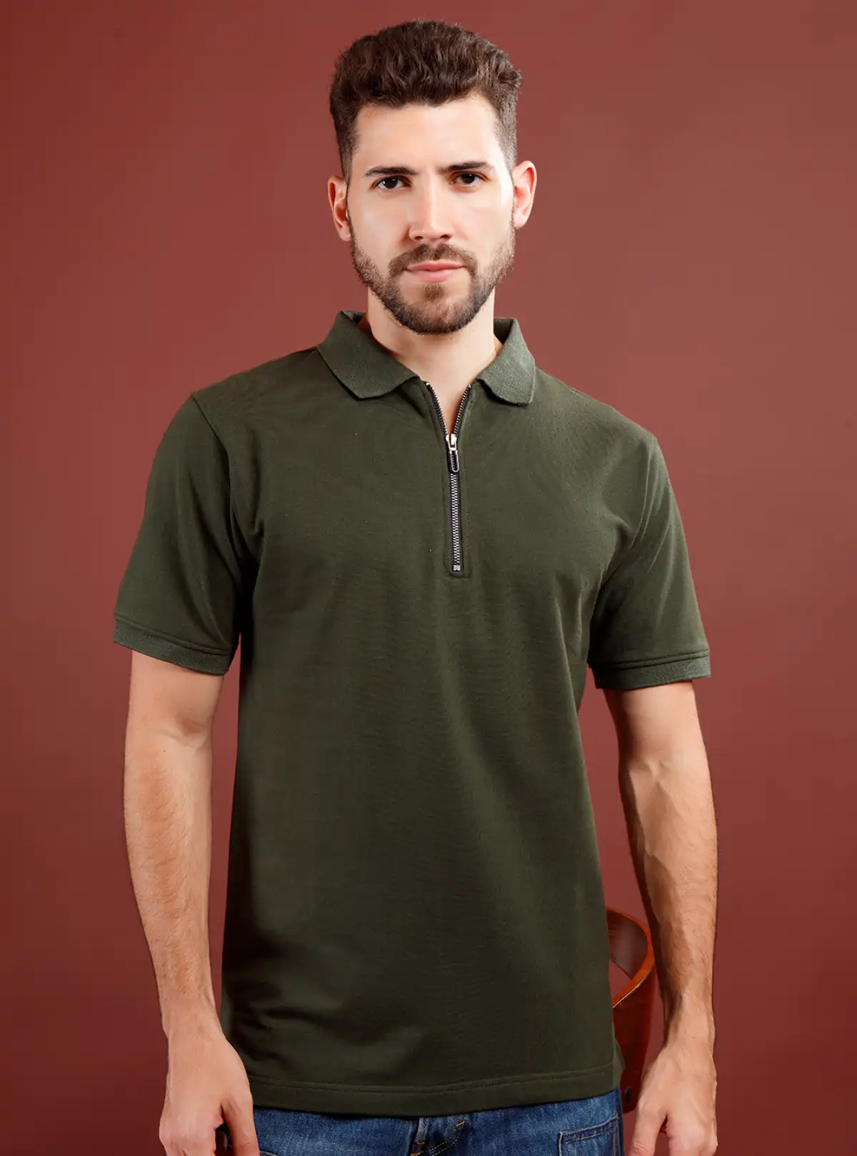 A versatile staple, this solid olive green T-shirt features a smart collar and zip placket, blending street style with casual ease. Made with 100% cotton (240 GSM) for a soft, structured feel that lasts all day.
